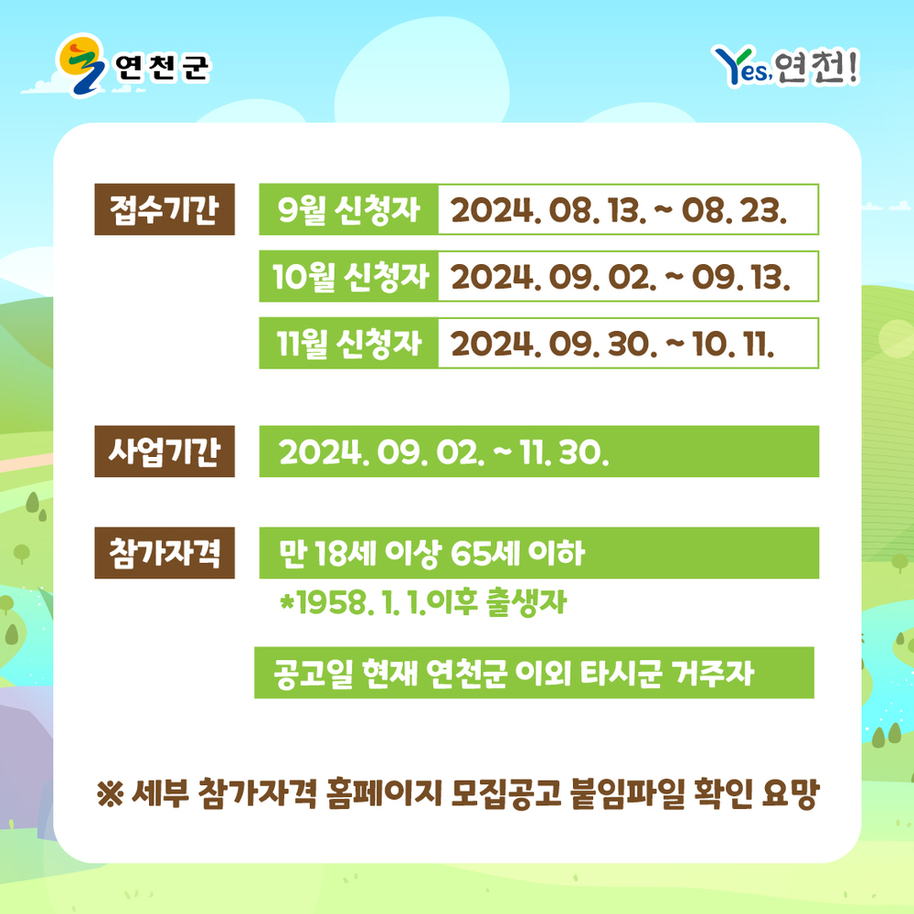 만 18세 이상 65세 이하의 (1958. 1. 1. 이후 출생자) 공고일 현재 연천군 이외 타시군 거주자를 대상으로 합니다.